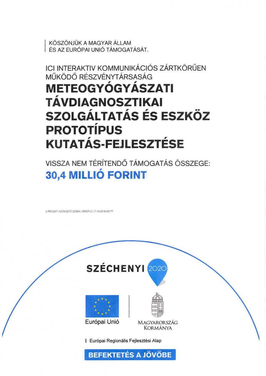 Az időjárás nagyon sok embernek okoz komoly egészségügyi panaszokat. Az ICI Interaktív Kommunikációs Zrt 2016. augusztus 1-én, az EU-s támogatású VEKOP-2.1.7-15-2016-0177 azonosítójú prototípus fejlesztési pályázat keretében indította el egy alapvetően új szemléletű meteogyógyászati® diagnosztikai eszköz és szolgáltatás kutatás-fejlesztését. A kétéves projekt során kifejlesztésre, tesztelésre és gyártás előkészítésre került egy olyan meteogyógyászati® on-line vizsgálati rendszer, ami az egyéni időjárás-érzékenység tömegesebb és hatékonyabb kivizsgálását teszi lehetővé. A projekt 2018. július 30-i befejezésével már az új eszközök is a páciensek rendelkezésre állnak a Meteo Klinikán. A projekt 49 367 001,- Ft teljes összegéből 30 400 201,- Ft (61,58%) az EU-s támogatás.